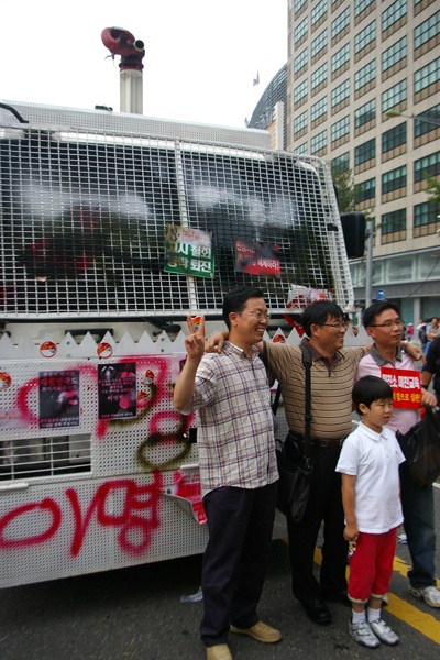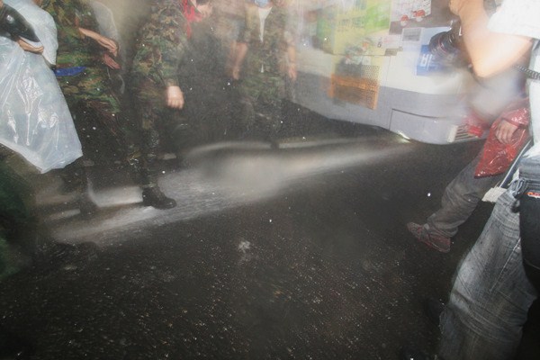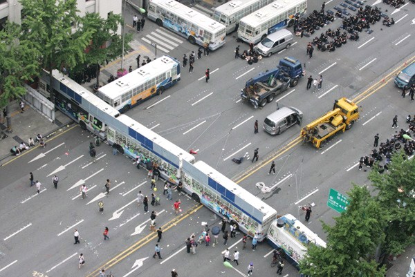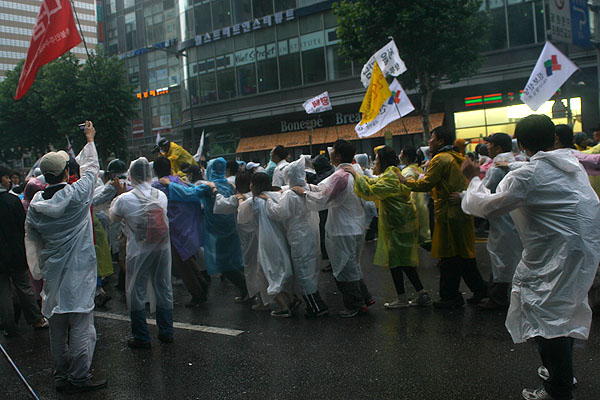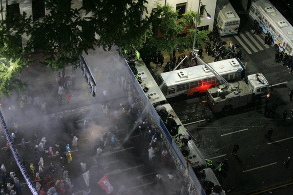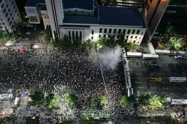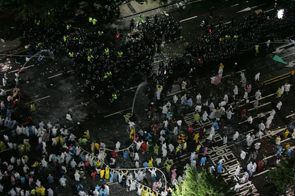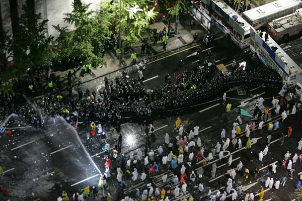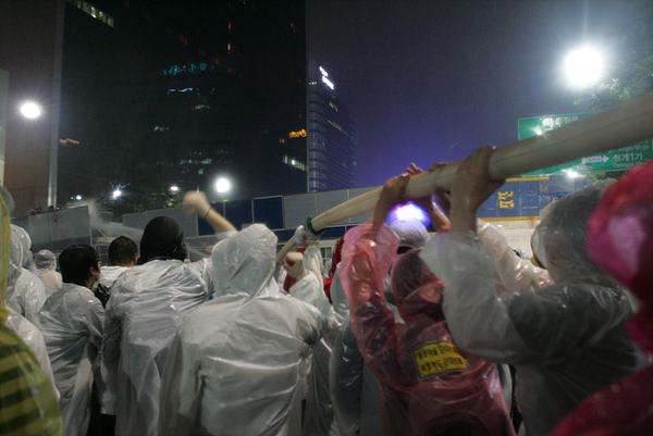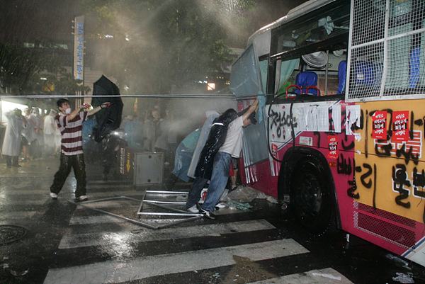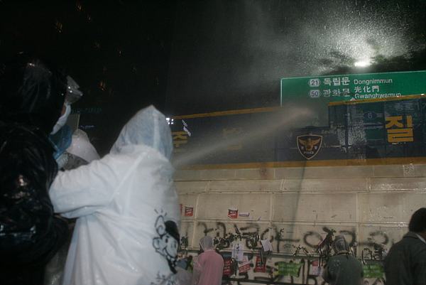 9시 10분경부터 물대포를 쏘기 시작한 경찰은 이곳 시민들이 살수에도 불구하고 전경버스에 달려들어 버스를 밀기 시작하자 소화기를 분사하기도 했다. 시민들은 깃발을 들고 앞으로 나와 소화기 분말가루를 조금이라도 날려 보내기 위해 깃대를 흔들고 있다.