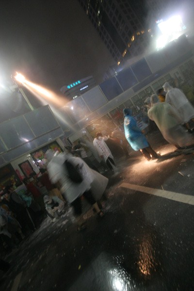밤 10시 15분 현재 "곧 형광물질을 섞어 살수하겠다"는 경찰의 경고방송이 나왔다. 경찰은 "이 색소가 섞인 물을 얼굴, 옷, 신발에 맞으면 절대로 지워지지 않는다, 끝까지 쫓아가서 연행하겠다"고 밝히고 있다. 아울러 "밤마다 폭동과 난동을 부리는 당신들은 선량한 시민이 아니"라며 "주변 시민들도 이들의 폭력행위를 말리지 않으면 공범"이라고 말해 인도 위의 시민들에게도 똑같이 살수할 것임을 시사했다.