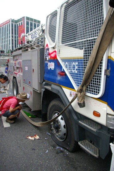 앞서 오후 5시 40분경에는 시청 부근 국가인권위원회와 재능교육 건물 사이에 주차돼 있던 경찰 살수차량 두 대의 물을 시민들이 빼내는 일도 있었다. 시민들은 살수차량에 연결돼 있던 소화전과의 연결 호스를 풀고 파이프를 열어 물을 빼냈다. 살수차 타이어의 바람을 빼고, 달려 있던 CCTV에는 스프레이칠을 해 놓기도 했다.
