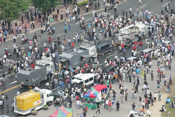 | 프레스센터 앞 도로에서 진압작전을 준비하고 있는 경찰 | ||