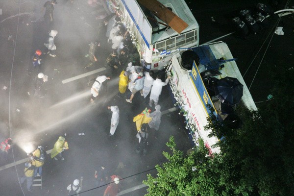 | 물대포를 맞아가며 전경버스를 밧줄로 끌어당기는 시민들 | ||