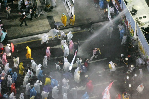 프레스센터 앞과 종로 방면 광화문우체국 앞 도로에서의 경찰 대응이 심각한 수준이다. 거의 쉬지 않고 물대포와 소화기를 쏘아대는 통에 이곳에 있는 시위대는 제법 굵은 빗방울이 떨어지고 있다는 사실도 의식하지 못할 정도다.
