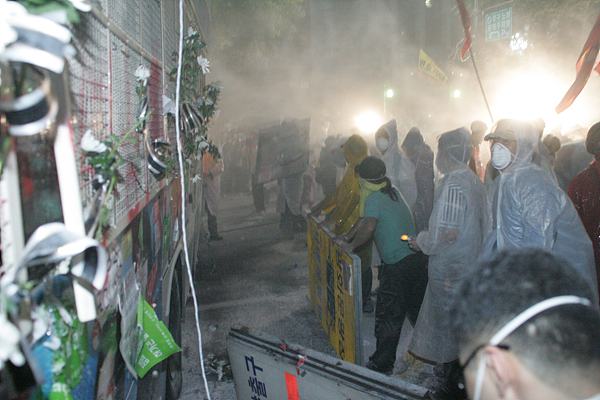 | 경찰이 차벽 사이로 소화기와 물대포를 난사하고 있다. | ||