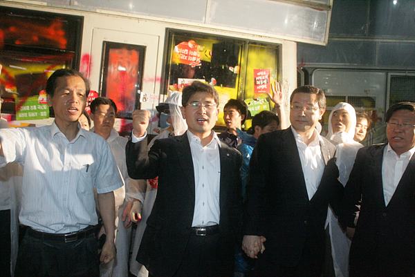 | 프레스센터 앞 대치 현장에 나타난 통합민주당 의원들 | ||
