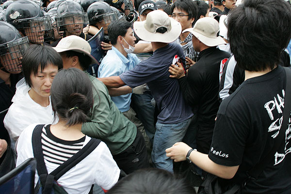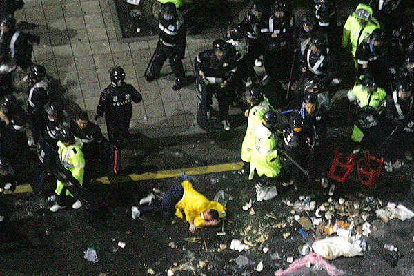 일부 시민들은 곤봉을 높이 든 전경들을 피해 달아나지 않고 오히려 전경 무리를 에워싸는 등 격렬한 난투극을 벌였다. 그러나 서울특별시의회 옆과 덕수궁 옆 서울시의회 별관 골목 두 곳에서 나온 전경들의 압박으로 시민들은 시청 광장 방향으로 많이 밀려난 상태다.