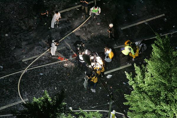 | 29일 0시 20분경 프레스센터 앞 진압. 경찰이 지나간 후 쓰러져 있는 시민. | ||