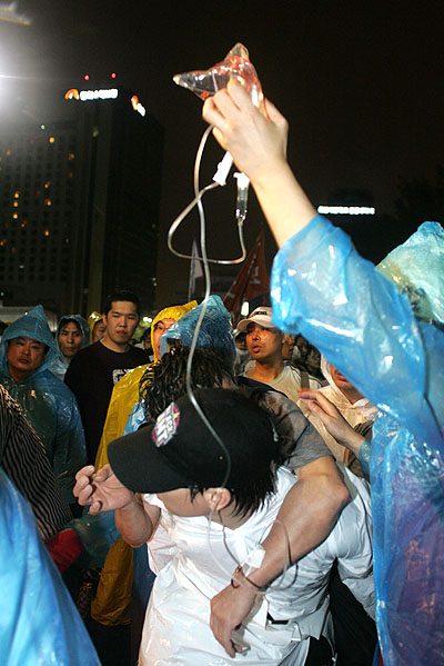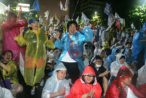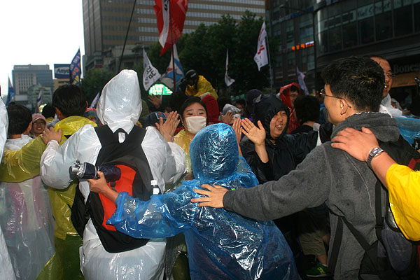 비를 피할 수 있는 곳곳마다 지친 시민들이 누웠고, 앉은 채로 꾸벅꾸벅 졸고 있는 사람들도 눈에 많이 띈다. 밤새 구호를 외치고 노래를 불렀고, 행진도 하고 전경들과 몸싸움도 한 데다 계속 내리는 비와 경찰의 살수로 몸이 푹 젖었는데도 시민들은 좀체 귀가할 생각을 하지 않고 있다. 새벽 5시 40분 현재 날이 밝았지만 여전히 '처음처럼', '아리랑' 등 흥겨운 노래에 시민들이 기차놀이를 하며 몸을 들썩였다.