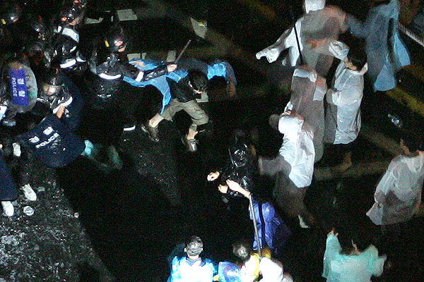 전경들은 방패를 무차별로 휘두르며 시민들을 밀어냈다. 이 과정에서 참세상 촛불집회 생중계 촬영을 하고 있던 본지 기자가 경찰이 휘두른 방패에 맞아 한때 생중계에 지장을 입는 사태도 발생했다.
