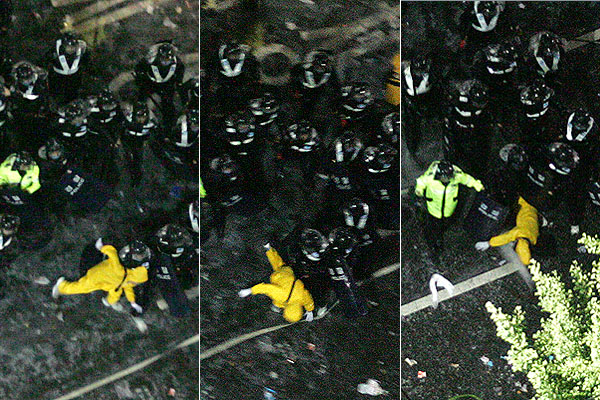 전경들이 나오는 모습을 보고 시민들이 천천히 뒤로 물러서던 도중 전경이 갑자기 빠르게 진압을 개시하는 통에 도망치다 넘어진 많은 시민들이 다쳤다. 전경들은 넘어진 시민들에게도 곤봉 세례를 퍼붓고 밟고 지나가는 등 전쟁터를 방불케 한다.
