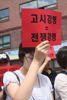 주최측은 방송 차량을 통해 "지금 이순간 무슨 말이 필요하겠냐, 국민들의 가슴에 분노의 불길이 활활 타오르고 있다"며 "재협상을 요구한 80% 국민의 뜻을 받아들일 때까지 고시강행을 결단코 용납하지 않고 촛불을 들겠다"고 선언했다. 아울러 "오늘 여기서 구호만 외치지는 않을 것"이라며 '실천투쟁'을 예고했다.