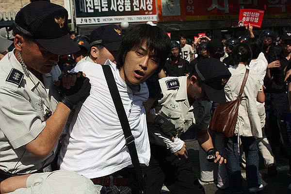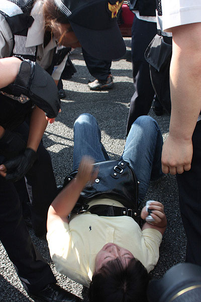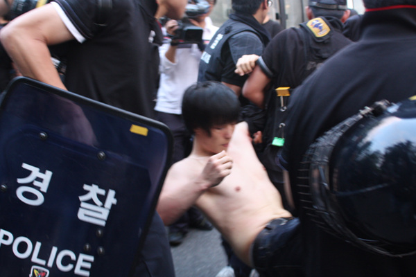 | 경복궁역 부근에서 경찰에 의해 윗옷이 벗겨진채 연행되는 시민 | ||