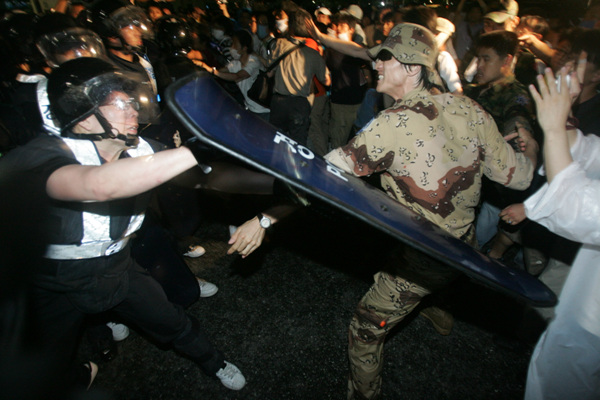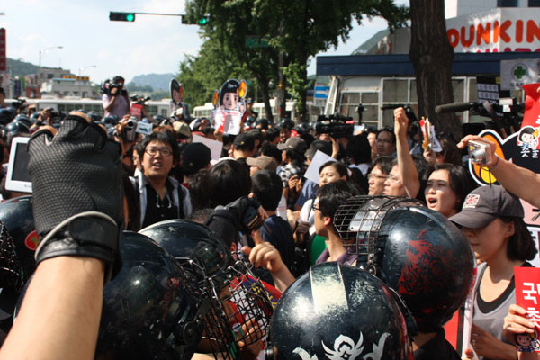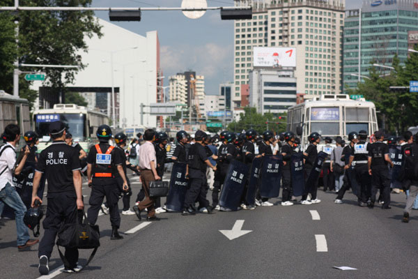 서대문 방향에서부터 전 차선을 차지한 전경들은 방패를 땅에 내리치고 고함을 지르며 도로로 밀려난 시민들을 세종로 사거리 방향으로 점차 밀어내고 있다. 이에 저항하는 시민들과 경찰들 사이에 도로 위의 격한 몸싸움이 빚어지는 중이다.