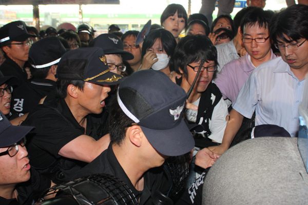 민노 국회의원, 초등학생 등 무차별 연행중 [3신 25일 16:30] 경복궁역 앞 시민들, 호송 버스 막고 경찰과 몸싸움