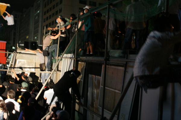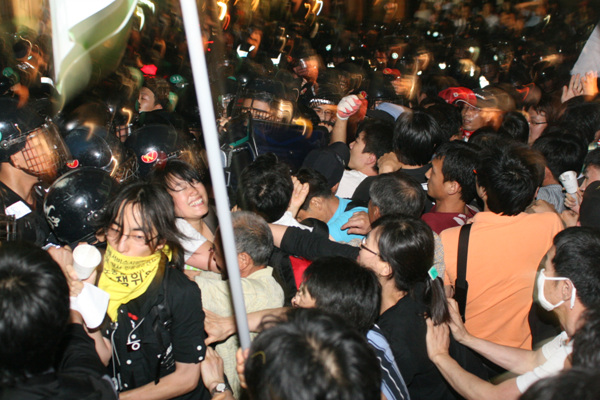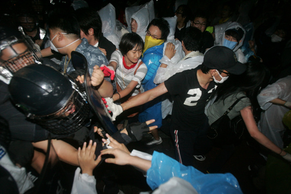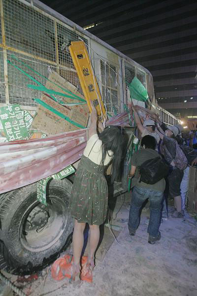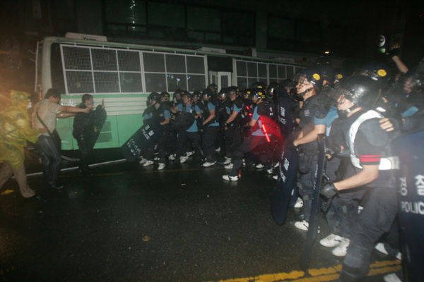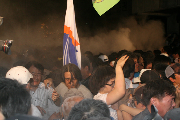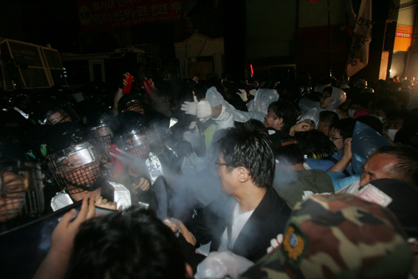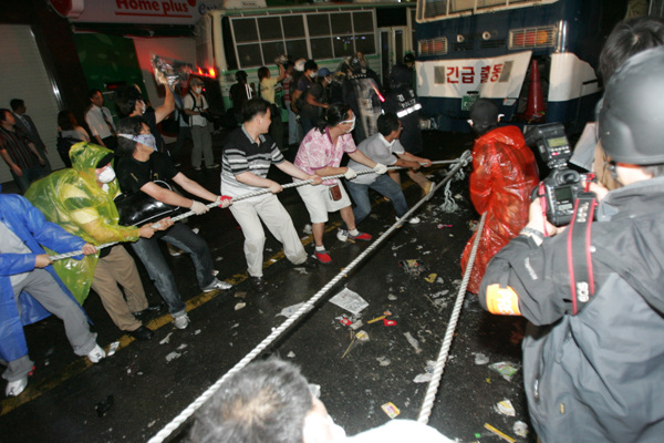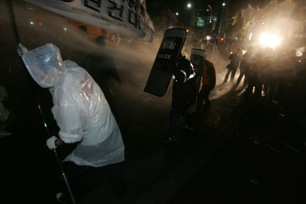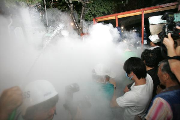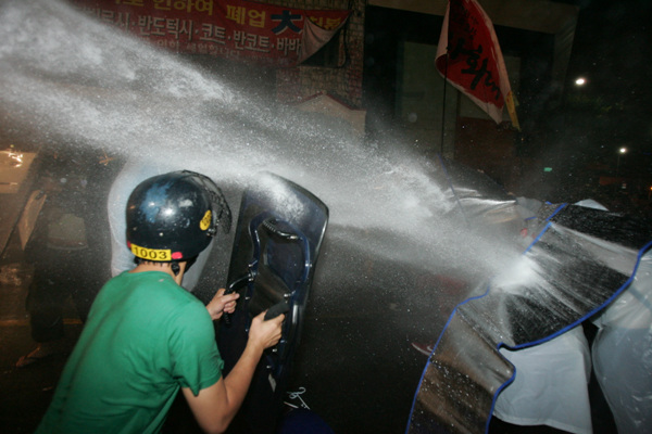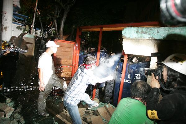 시민들이 전경버스를 끌어낸 자리에 틈이 생기면 전경들이 앞으로 나와 시민들과 대치하면서 동시에 소화기와 물대포를 쏘아댔으며, 시민들이 잠시 물러나면 뒤편에 다시 전경버스를 보강하는 조치가 반복되고 있다. 이 부근 골목은 현재 어느 차에서 연료가 샌듯 살수된 물과 섞여 바닥이 대단히 미끄러운 상태다. 물대포를 직격으로 맞아 쓰러진 시민 몇 명이 구급차에 실려가기도 했다.