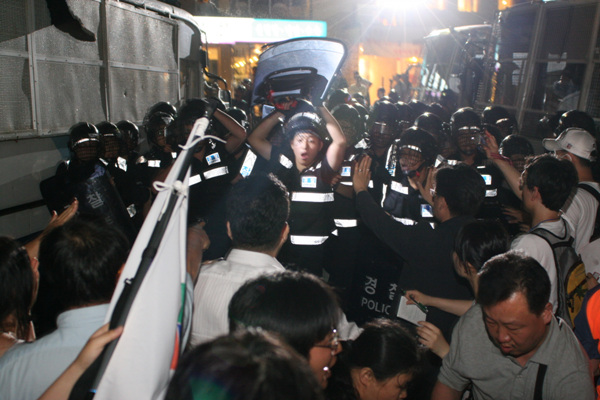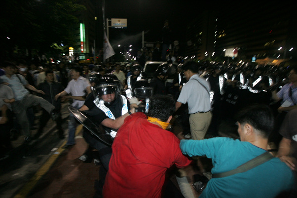 살수차를 대동하고 서대문 방향에서 쏟아져 나온 전경들은 새벽 2시 40분 현재 세종로 사거리를 완전히 장악했다. 새문안교회 옆 골목에 있던 시민들을 완전히 몰아내고 8차선 도로 전체에서 시민들과 대치한 경찰은 새벽 2시경 고함을 지르며 일제히 뛰쳐나와 순식간에 수천 명의 시민들을 시청 방향으로 밀어냈다.