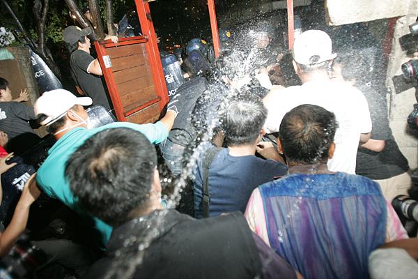| 호스로 물을 끌어다 뿌리는 시민들과 소화기로 맞서는 경찰 | ||