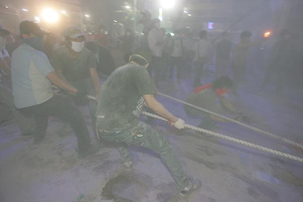 | 세종로 사거리 차벽 앞에서 소화기 분말을 막아보려 안간힘을 쓰고 있는 시민들 | ||