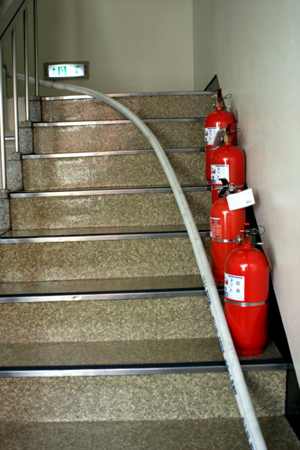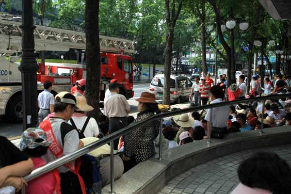 | 인권위 옥상으로 올라가는 통로는 진입당시 전시청련 소속 회원이 뿌린 시너냄새가 진동하고 있다. 만약의 경우를 대비해 경찰과 소방관이 대기하고 있으며, 화재를 대비해 소화기와 소방호스가 준비 돼 있다. ⓒ전진호 기자 | ||
