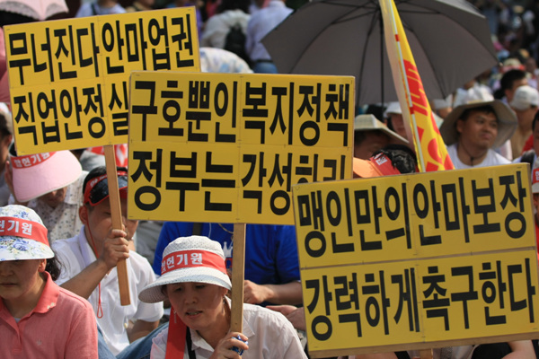 대한안마사협회 주최로 열린 보신각 집회에는 시각장애인 안마사 600여명이 모여 '장애인 죽이면서 평등권 좋아하네', '희망없는 안마교육 수업거부 당연지사'등의 피켓을 들고 오후 1시부터 6시까지 이글거리는 태양볕 아래에서 집회를 이어갔다.