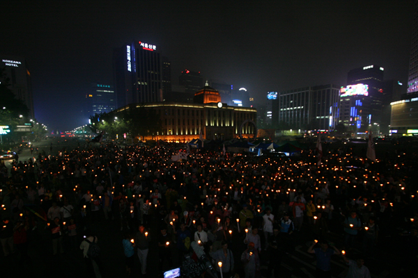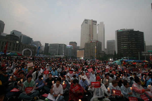 저녁 10시 현재 숭례문-명동-을지로-종각-세종로 사거리를 거쳐 시청으로 다시 되돌아온 촛불집회 참가자들은 6월 10일 이 자리에 다시 100만 시민이 모이자고 다짐했다.
