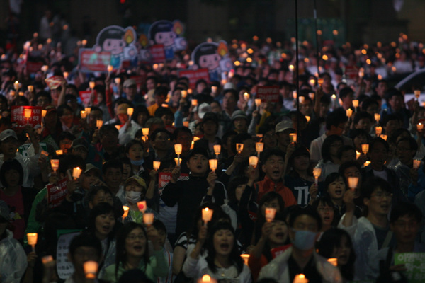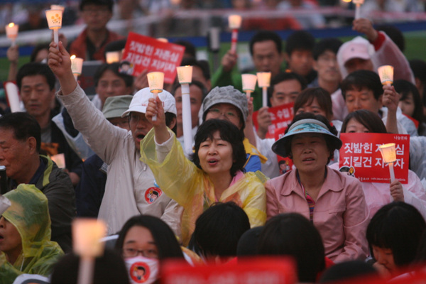 두 아이의 엄마라는 김은희 씨도 "정부는 '쇠고기 졸속협상 한 것 인정한다. 눈물겹게 반성하고 재협상하겠다'고 이야기해야 한다"고 입을 모았다. 김 씨는 "눈물을 얼마나 흘렸는지 모른다. 이명박은 대통령이 아니라 CEO로 계속 있어야 했던 사람"이라고 이 대통령을 질타했다.