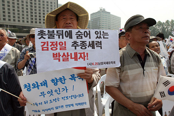 시종 '빨갱이 성토대회'처럼 진행되고 있는 이 집회에서는 현재 벌어지고 있는 촛불집회의 배후로 전교조, 통일실천연대, 참여연대, 범민련, 민주노총 등이 언급됐다. '주요 핵심세력 5인자'라며 오종렬·한상열 한국진보연대 상임대표, 박원순 변호사(참여연대), 강기갑·천영세 민주노동당 의원 등을 직접 거명하기도 했다.