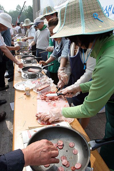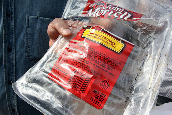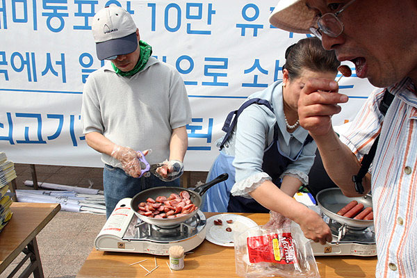 뉴라이트전국연합 측이 수입상가에서 구입했다는 미국산 소시지. 주 재료는 소와 돼지의 염통(심장)이라고 표시돼 있다.