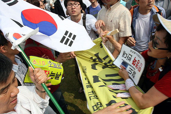 국민대회에 참가한 일부 노인들이 시청 광장 주변에서 깃발과 피켓을 만들고 있는 여학생들에게 시비를 거는 모습도 보였다. 이들은 손에 들고 있던 태극기로 여학생들의 머리를 툭툭 치며 "빨갱이들은 가라"는 등 욕설을 내뱉었다. 잔디광장에 발을 들여놓은 시민에게 국민대회 참가자가 발길질을 하며 싸우는 등 곳곳에서 크고 작은 마찰도 일었다.