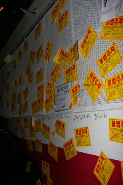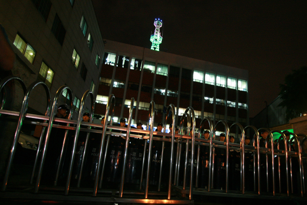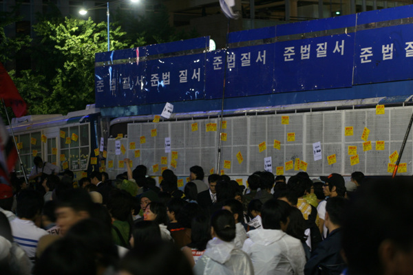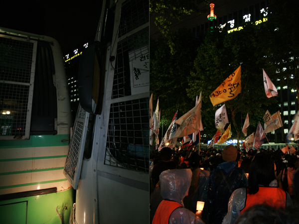 오늘(3일) 촛불문화제는 서울 시청 앞 광장과 더불어 청계광장 앞에서도 열리고 있다. 청계광장 앞에서는 민주노총 주최로 6백 여 명의 소속 조합원들이 모여 ‘협상무효! 전면 재협상! 이명박 폭력정권 규탄 촛불대회’를 열고 있다. 이 곳에는 민주노총 산하 공공노조, 운수노조, 금속노조, 공무원노조, 보건의료노조, 경기본부 등이 참여했다.
