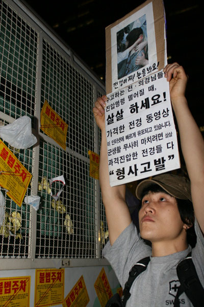 지난 31일부터 2일까지 발생했던 경찰의 폭력진압에 대한 규탄도 이어졌다. 국민대책회의에서 일하는 임태훈 인권활동가는 “폭력을 행사한 전의경보다 이를 사주한 어청수 경찰청장이 더욱 나쁘다”라며 “어청수 청장을 반드시 퇴진시켜야 한다”라고 목소리를 높였다.