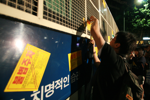 한편, 청계광장에서 열렸던 촛불대회에 모인 민주노총 조합원들은 “마치 재협상을 할 것처럼 관보게재를 연기하더니 다 꼼수였다”라며 “노동자들이 책임있게 나서야 한다”고 입을 모았다. 조합원들은 “대한민국의 SRM 2MB를 제거하자”라는 구호를 크게 외치기도 했다.