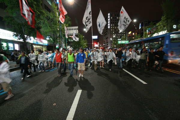 경찰청 앞에서 “어청수 경찰청장 즉각 사퇴”를 요구하던 시민들은 다시 뒤로 돌아 전차선을 점거하고 세종로로 행진을 진행했다. 오후 10시경 세종로 사거리에 도착한 시민들은 청와대 방면으로 둘러져 있는 전경버스 벽 앞에서 “이명박은 물러가라”를 외치며 시위를 이어가고 있다. 한 편에서는 시민들의 즐거운 노래 공연이 이어지고 있기도 하다.
