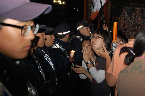 어제(4일) 밤 시청 앞 촛불집회 풍경은 묘했다. 대책회의가 72시간 시위를 앞두고 건너가는 날로 집회를 이끌었다. 9시쯤 해산을 했지만 ‘아고라’ 깃발과 함께 시민들은 광화문 앞에 다시 모여 늦은 시간까지 시위를 했다. 전날(3일)도 마찬가지였다. 대책회의든 운동권이든 지도나 통제 따위와 관계없이 대중들은 움직인다.