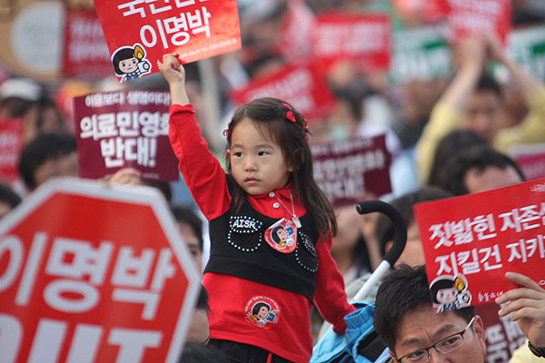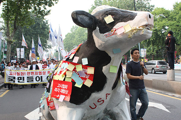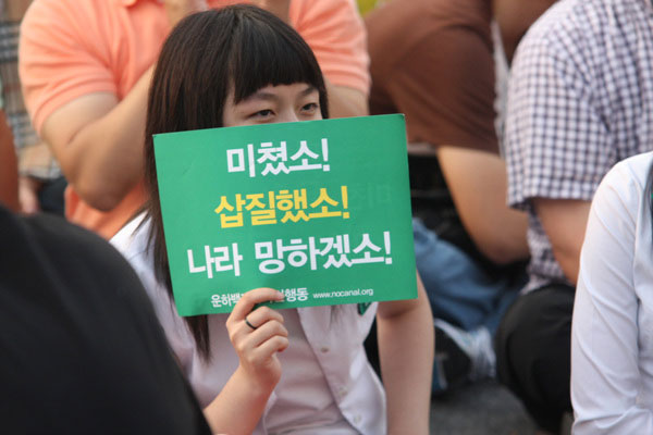 오늘 촛불문화제에선 어제 이명박 대통령이 불교계 4대종단 총무원장과 만난 자리에서 "재협상은 할 수 없다"고 못박은 데 대한 분노가 터져나왔다. 촛불문화제 사회자는 "무엇과도 바꿀 수 없는 국익인 국민의 건강권을 포기해 놓고, 이제와서 '재협상하면 다른 국익이 손상될 수 있다'는 이명박 대통령, 한글만 모르는 줄 알았더니 논리적으로도 문제가 많다"고 성토했다.