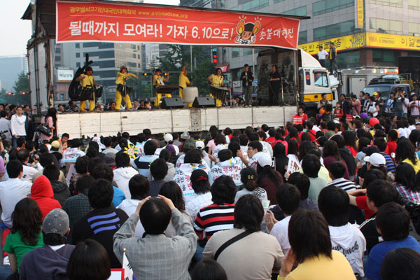 촛불문화제 무대에는 "될 때까지 모여라! 가자 6.10으로!"라고 적힌 플래카드가 걸려 있다. 시민들은 '임을 위한 행진곡'과 '헌법 제1조', '아침이슬' 등을 합창하며 "이명박은 물러나라", "재협상을 시작하라", "국민들이 승리한다", "가자! 6.10으로" 등의 구호를 번갈아 외쳤다.