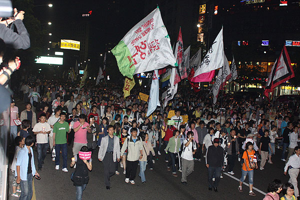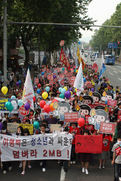대학로 마로니에 공원 주변이 범국민대회에 참가하기 위해 모여든 시민들로 인산인해를 이루자 주최측은 오후 4시 30분경부터 시민들을 차도로 안내하며 즉시 행진에 나설 것을 제안했다. 행진 참가자들은 "국민이 이깁니다"라고 적힌 현수막 등을 들고 "이명박은 물러가라", "민주시민 함께해요"등의 구호를 외치고 있다. 맨 앞에는 청소년들이 "이명박은 청소년과 싸운다, 덤벼라 2MB"라고 적힌 현수막을 들었다.