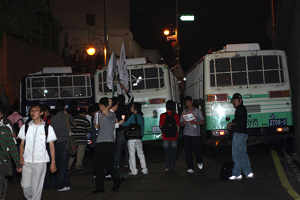 참가자들은 사직터널 앞 고가도로에서 전경버스로 행진 방향이 막히자 "영차 영차"라고 소리를 지르며 함께 전경버스를 밀기도 했다. 가운데 쪽에 있던 전경버스에는 누군가 검은색 스프레이로 "어청수는 물러나라"는 글을 써 놓기도 했다. 이곳에선 백기완 통일문제연구소 소장이 나와 전경버스를 미는 이들을 독려하기도 했다. 밤 11시 40분경 이쪽에 있던 대부분의 행진 대오는 발길을 돌려 광화문으로 왔으나, 아직 몇백 명의 시민들은 떠나지 않고 있다.