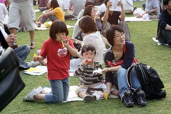 | 촛불문화제를 기다리고 있는 가족 단위 참가자들 | ||