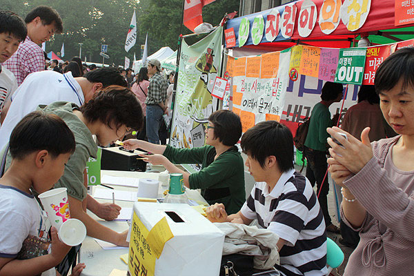 공공노조에서 진행하고 있는 물, 가스, 전기 민영화 반대 서명운동에는 시민들이 서명을 위해 줄을 서서 기다릴 정도로 호응이 높다. 인권단체들도 인권침해감시단 부스에서 집시법 폐지 서명을 받고 있다.