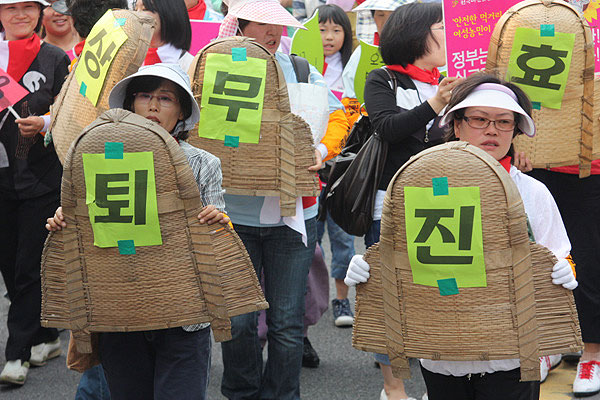 제주도에서 온 40대 여성 농민도 무대에 올라왔다. 이 시민은 "제주도에서도 제주시청 앞에서 촛불집회를 할 때마다 인터넷에 나온 여러분의 모습을 화면으로 본다"며 "너무 눈물겹고 힘이 솟아 여러분들에게도 제주도 소식을 전해드리고 싶다, 오늘 처음으로 서귀포에서도 촛불집회가 열린다"고 말해 참가자들의 환호를 받았다. 또 "비행기삯 20만 원이 아까웠지만 이명박이 재협상을 할 수 없다는 말에 울화통이 터져 올라왔다"면서 "우리 농민들은 농사지은 죄밖에 없다, 이명박 어청수 한미FTA 다 키에 넣고 찌끄레기들을 날려버리겠다"며 준비해 온 키를 흔들었다.