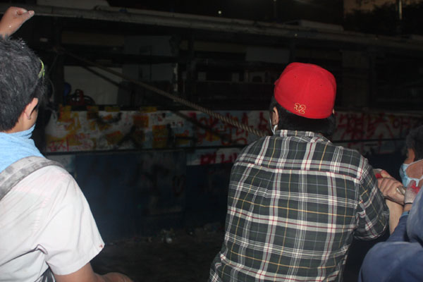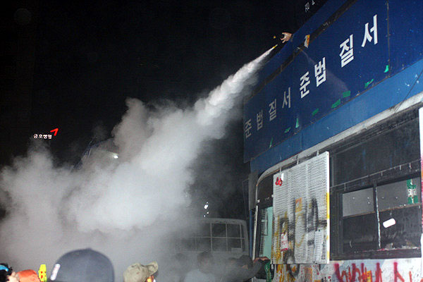 전경버스에 밧줄을 묶은 일부 시민들은 차량을 줄로 끌어당기고 있으며, 경찰은 계속 소화기를 난사하는 동시에 "불법집회를 즉시 중단하시기 바랍니다"라는 경고방송을 계속해서 내보내고 있다. 시민들은 이에 "너희들이 불법이다"라는 구호로 맞서고 있다.