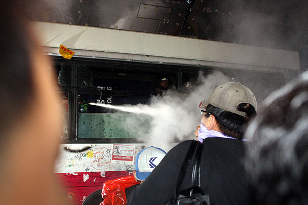 밤 12시 40분경부터 세종로 사거리에 모인 시민들은 행진을 가로막은 전경버스의 철조망 창문을 뜯어내는 등 청와대로의 행진 의사를 강하게 표현했다. 전경버스 안에 있던 전경들은 뜯겨진 창문을 통해 참가자들을 향해 소화기를 분사했다.