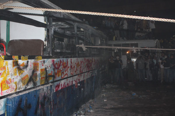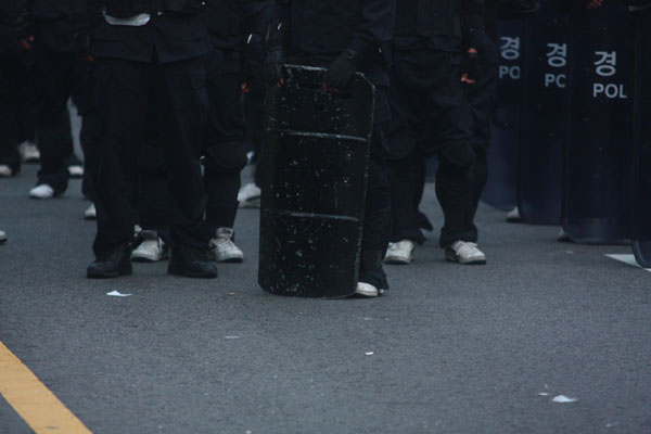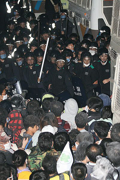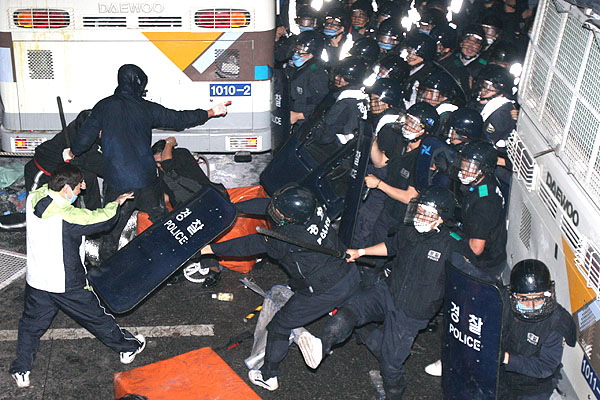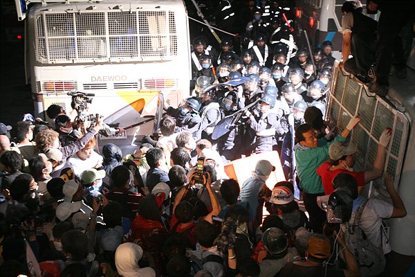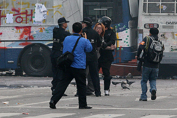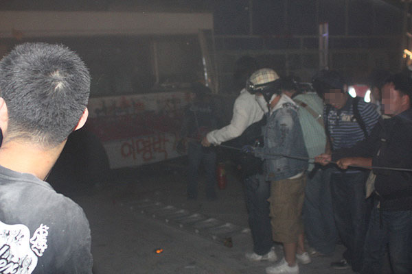 사다리를 통해 전경버스 위로 올라가려던 시민들에게 전경이 머리 위로 방패를 휘두르는 바람에 한 시민이 머리를 방패에 찍히기도 했다. 전경버스 위로 올라서는데 성공한 몇몇 시민은 버스 위에 있던 전경들이 에워싸 모습을 감췄다. 현장은 매우 혼잡하며 연행자와 부상자는 아직 파악되지 않고 있다.