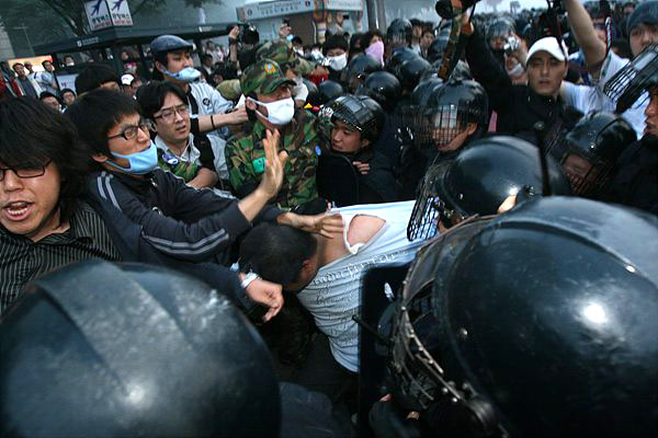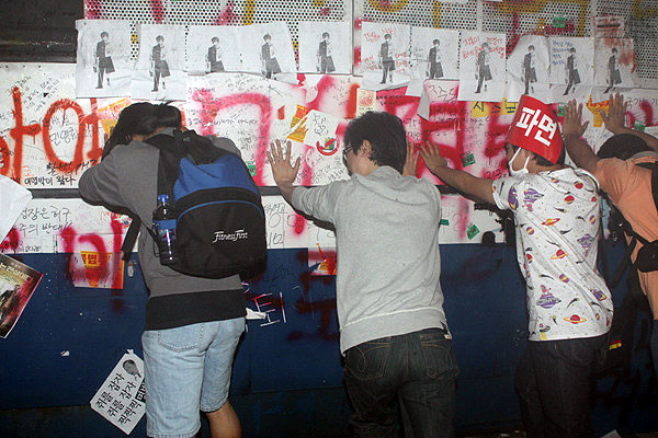 | 이날 촛불시위 참가자들은 광화문 이순신 동상 앞에서 격렬한 공방을 벌였다. | ||