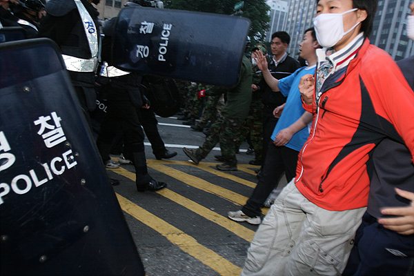 시민들이 또다른 차량을 끌어내려 밧줄을 묶어 당기자 이윽고 경찰 병력이 교보빌딩 쪽에서부터 대거 투입됐다. 새벽 5시를 조금 넘겨 전경들이 쏟아져 나오자 시민들은 "천천히, 천천히"를 외치며 피했으나 10분여 만에 거의 모든 참가자들이 인도 위로 밀려 올라갔다.