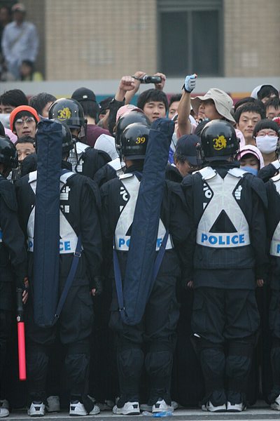 경찰은 두 시간 전부터 계속해서 "지금 여러분께서는 비폭력을 주장하시면서 폭력 시위를 벌이고 계십니다, 즉시 불법행위를 중단하시기 바랍니다"라는 경고방송을 내보내고 있다. "여러분, 많은 언론과 시민들이 여러분을 지켜보고 있습니다, 폭력을 중단하고 평화적으로 의견을 주장해 주시기 바랍니다, 여러분들의 집회는 절대 비폭력이 아니며 어느 누구의 지지도 받을 수 없습니다, 말과 행동이 일치하는 모습을 보여 주십시오"라는 등의 내용이다. 시민들은 경고방송이 나올 때마다 경찰을 향해 야유를 보내고 있다.