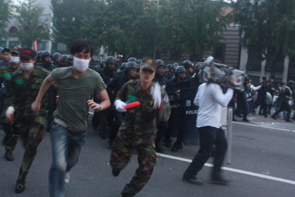 경찰은 서둘러 인도와 차도 사이에 대열을 지어 시민들이 다시 도로로 내려오는 것을 막았으며, 인도 위로 몰린 시민들은 "폭력경찰 물러가라", "어청수를 구속하라"는 등의 구호를 외치며 경찰들에게 항의했다. 시민들이 빠져나간 도로 위는 청소차량을 필두로 차량 통행이 재개됐다.