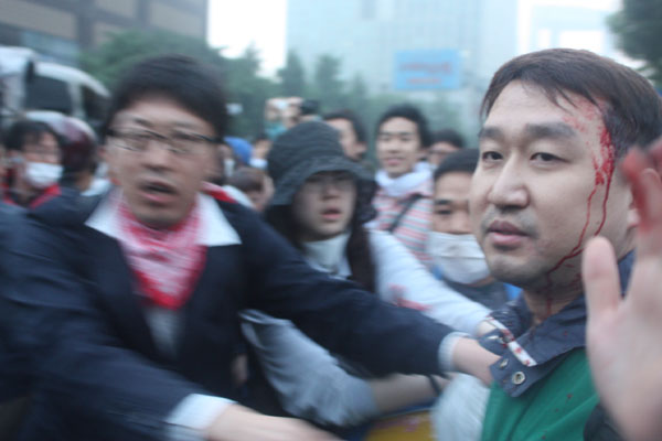 | 경찰 방패에 맞아 한 시민이 피를 흘리고 있다. | ||