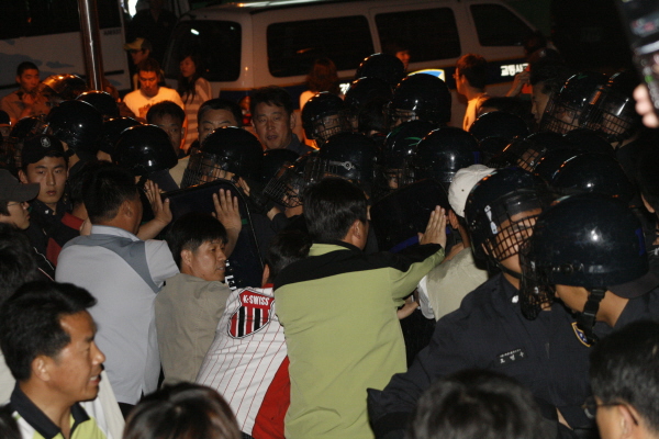 행진 대오는 인도를 가로막은 경찰과 한시간 가량 밀고 당기는 실랑이를 벌였다.