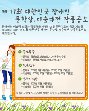 응모 자격은 장애인 등록에 된 자에 한하며 문학상 접수기간은 9월 10일부터 10월 12일까지, 미술대전은 10월 22일부터 26일까지다. (문의 : 02-3433-0625)